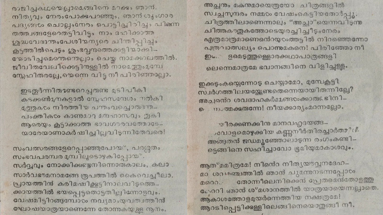 എന്ന ആപ്തവചനത്തിന്റെ മറെറാരു വകഭേദമായിരുന്നു. കവിത അനർഗ്ഗളമായി ഒഴുക്കിക്കൊണ്ടിരുന്ന കണ്ണീരോടുകൂടിത്തന്നെ യാണു എഴുതിത്തീർത്തത്, ഒറ്റയ്ക്ക് ഒരു മുറിയിലിരുന്നു. എന്റെ കണ്ണുനീരുവീണു കടലാസ്സിലെ എഴുത്തുകളിൽ മഷി പടർന്നു.
