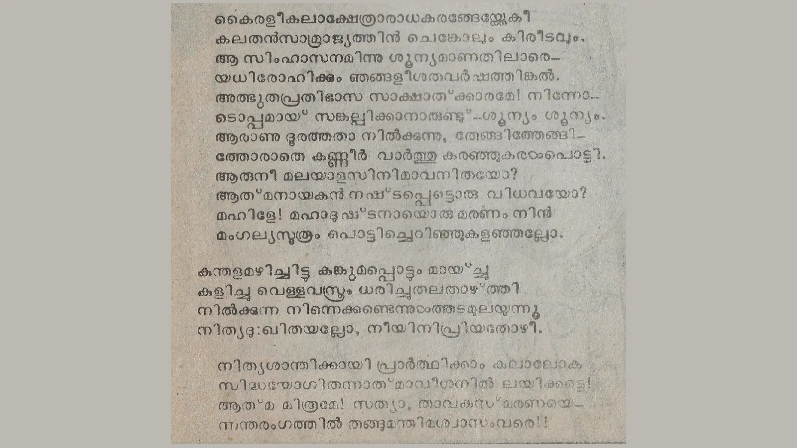 അതുകഴിഞ്ഞ് ഞാൻ നേരേ എന്റെ വീട്ടിൽ വന്നു. ധാരധാരയായി ഒഴുകിയ കണ്ണുനീരിനെ തുടച്ചു തുടച്ചുമാറ്റിക്കൊണ്ട് ഞാനൊരു കവിതയെഴുതി. “അശ്രുപൂജ”.